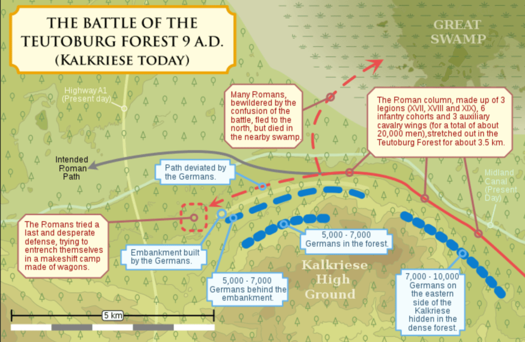 An alliance of Germanic tribes, led by the Germanic “barbarian” Arminius (who had acquired Roman citizenship and received a Roman military education, allowing him to personally deceive the Roman commander and foresee the Roman army’s tactical responses) ambushed and decisively destroyed three Roman legions (of somewhere between 16,000 and 36,000 men) and their auxiliaries, led by Publius Quinctilius Varus.