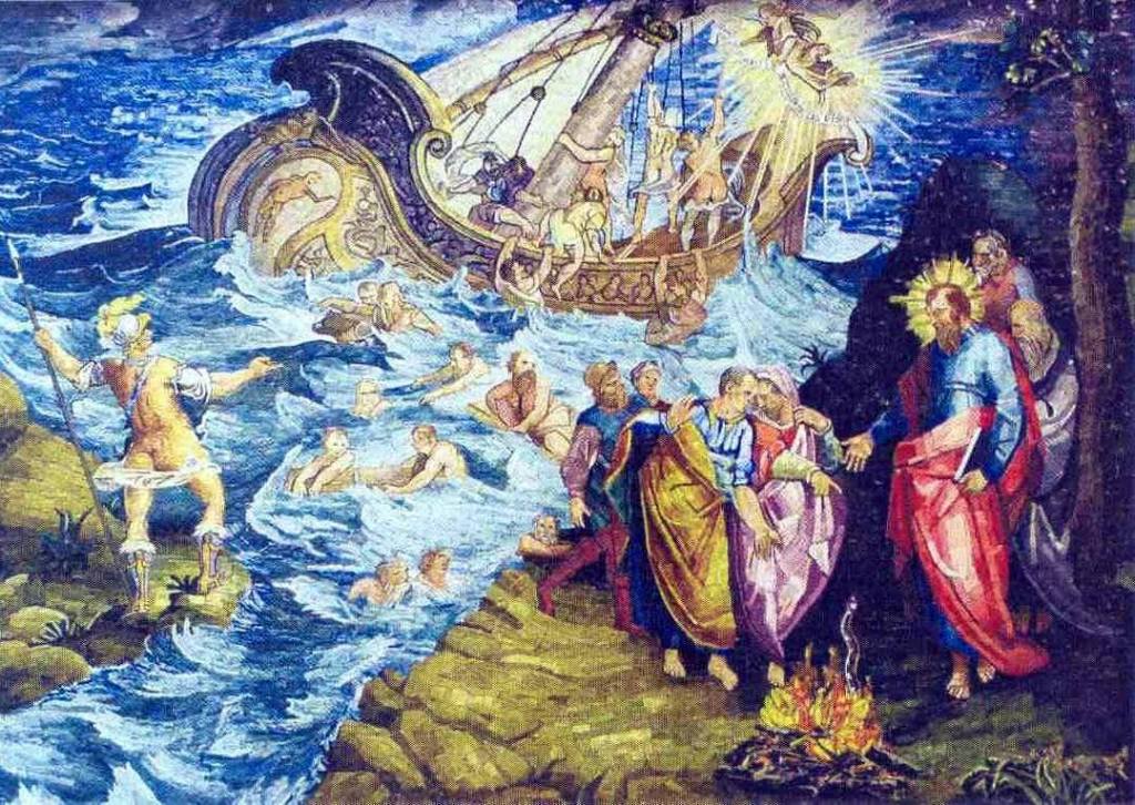 Late in A.D. 59 Paul, accompanied by Aristarchus from Thessalonica and Luke the Evangelist and in the custody of the Roman centurion Julius embarked on a 2,000 mile voyage to Rome. They stopped at Sidon (in modern day Lebanon), and then sailed onto Myra on the south western coast of Anatolia, where they changed to a larger ship (a 180 foot grain ship with a crew of 276). They then sailed to Salome in eastern Crete, and then to Fair Havens in southern Crete. They then continue westwards across the Mediterranean through various stormy seas and they got lost. They continue on westward using all their maritime skills to survive the storm including using sea anchors and jettisoning their cargo until they wrecked the ship on a reef off the coast of Malta. All were able to swim safely to shore. They then wintered on Malta and enjoyed the hospitality of Publius, and leading citizen of Malta.